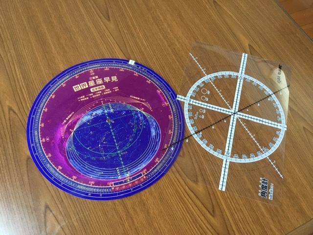 星座早見盤と角度計です。アナログ版ナビゲーションツールっていうところです。今、どんな星座が見えるのか、または、自分の見たい星座はいつ頃みえるのか、などを調べることができます。